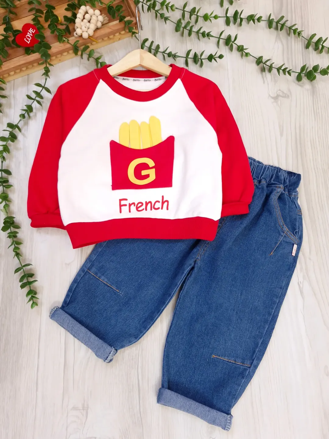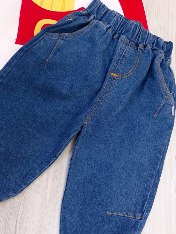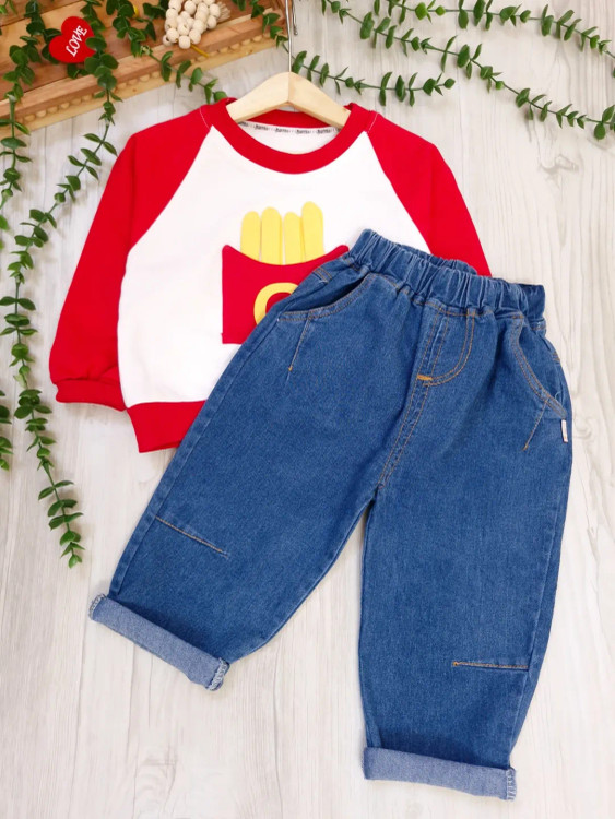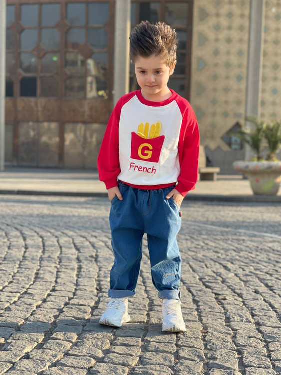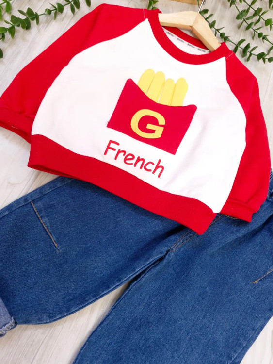 ست بلوز شلوار بچگانه اسپرت وارداتی اورجینال طرح french جنس بلوز دورس دونخ ، شلوار جین