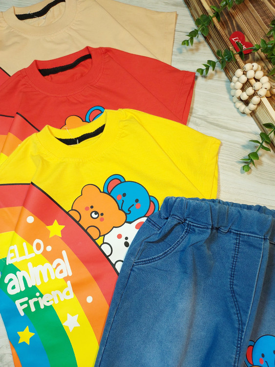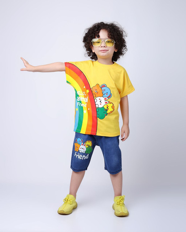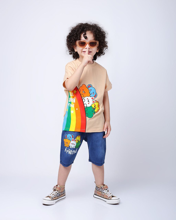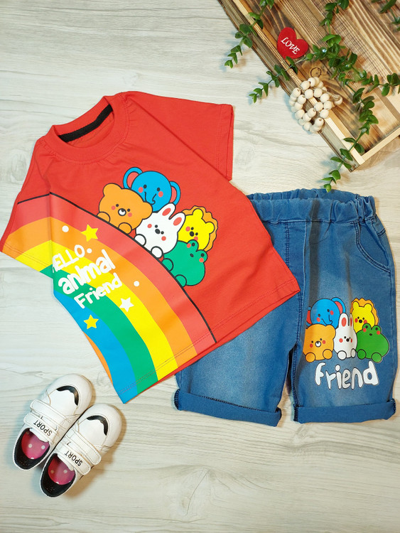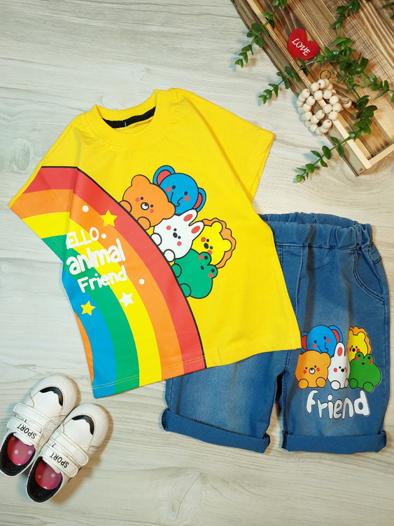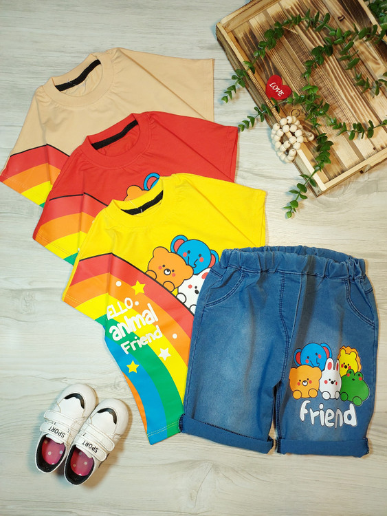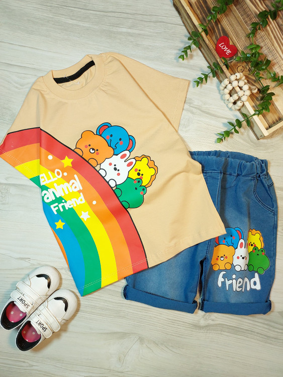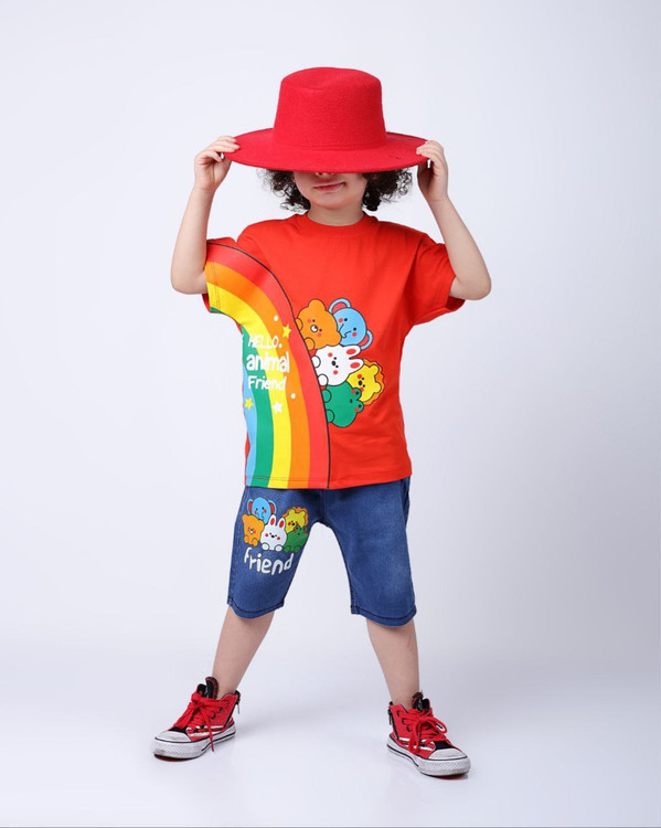 ست تیشرت شلوارک بچگانه اسپرت طرح رنگین کمان جنس جین کاغذی